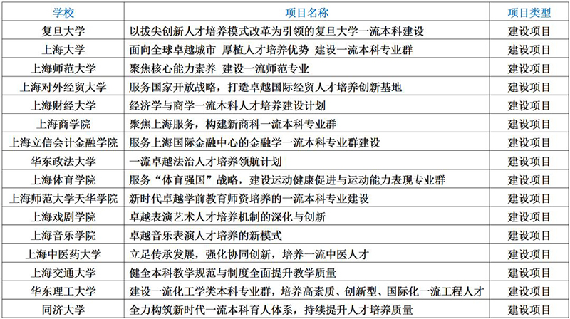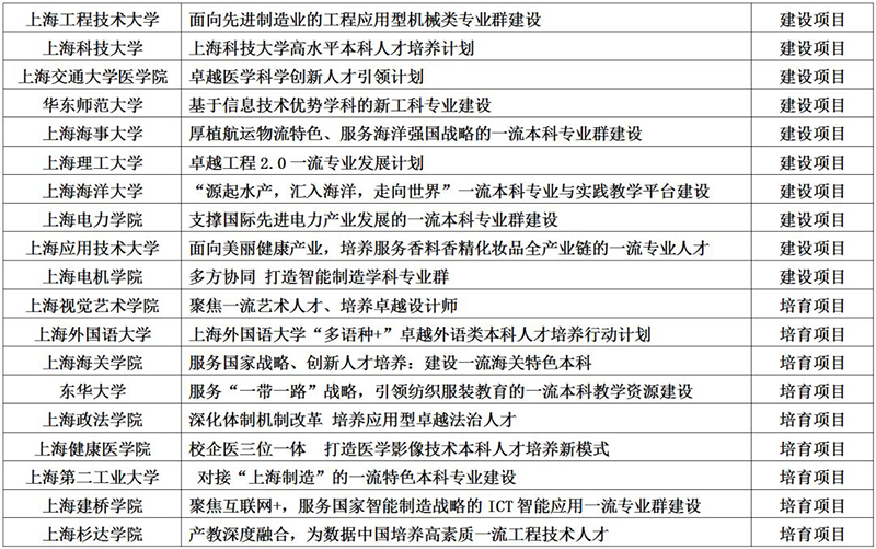 市教委近日公布了上海高等学校一流本科建设引领计划首批入选项目名单!首批入选项目35项,其中26项列为建设项目、9项列为培育项目。市教委将为入选项目提供专项经费支持,专项经费支持额度及管理办法另行制定发布。