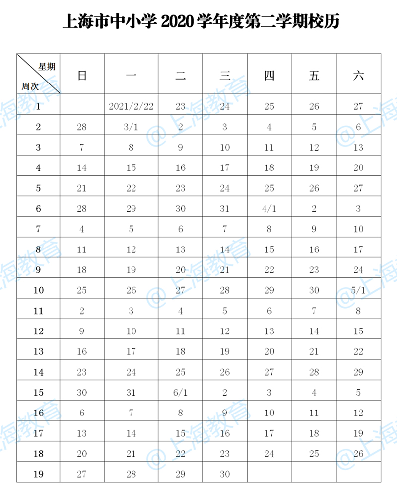 2021年2月22日开学,6月30日结束,全学期共19周。暑假从7月1日开始,8月31日结束。