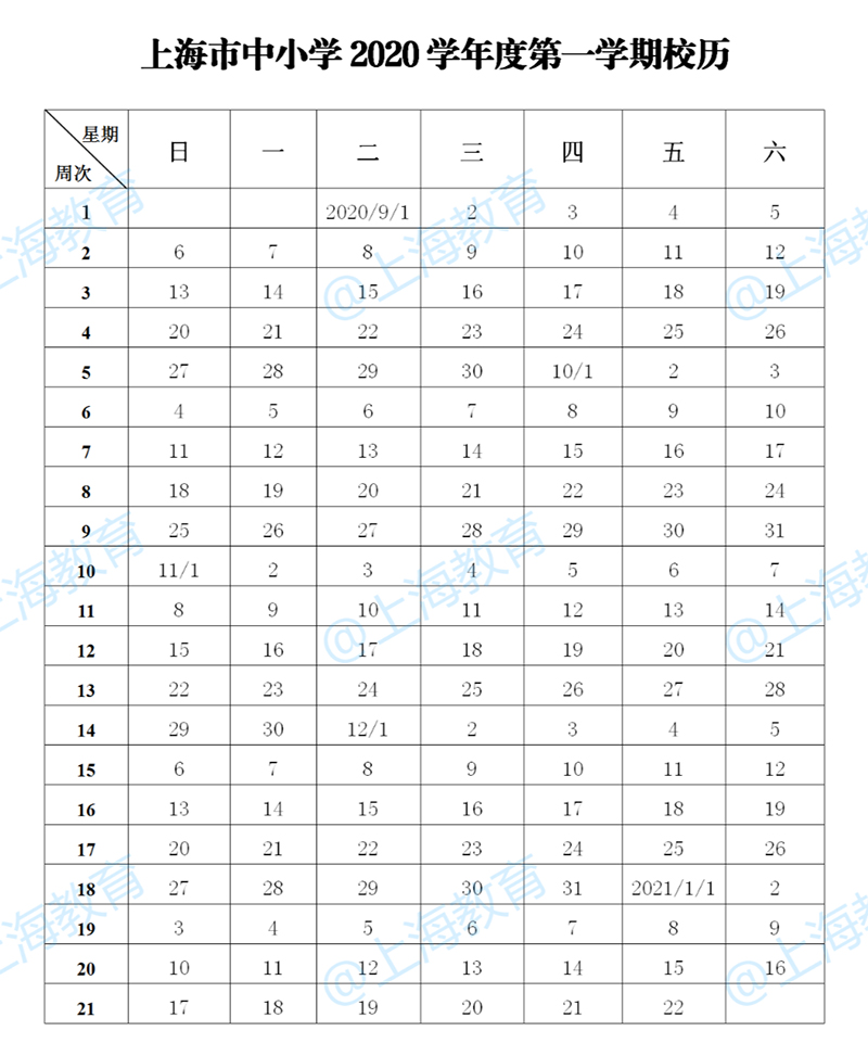 2020年9月1日开学,2021年1月22日结束,全学期共21周。寒假从2021年1月23日开始,2月21日结束。