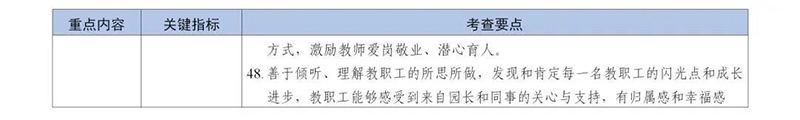 (五)教师队伍。包括师德师风、人员配备、专业发展和激励机制等4项关键指标,旨在促进幼儿园加强教师师德工作,注重教师专业能力建设,提高园长专业领导力,采取有效措施激励教师爱岗敬业、潜心育人。