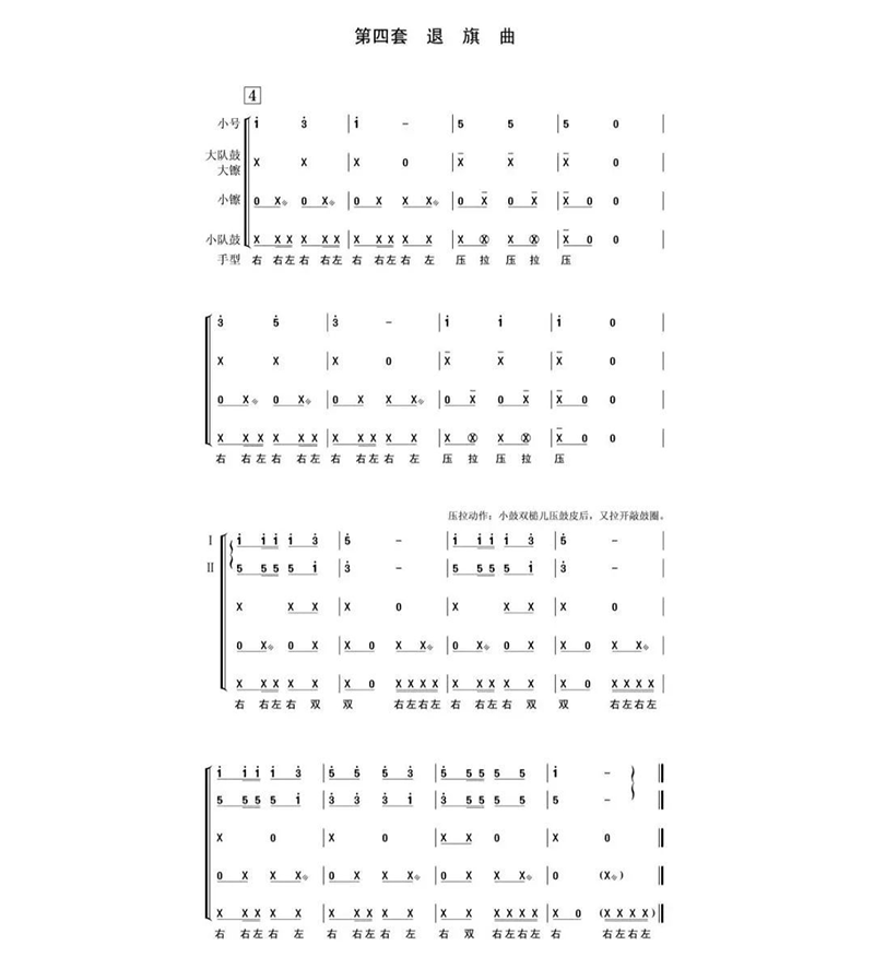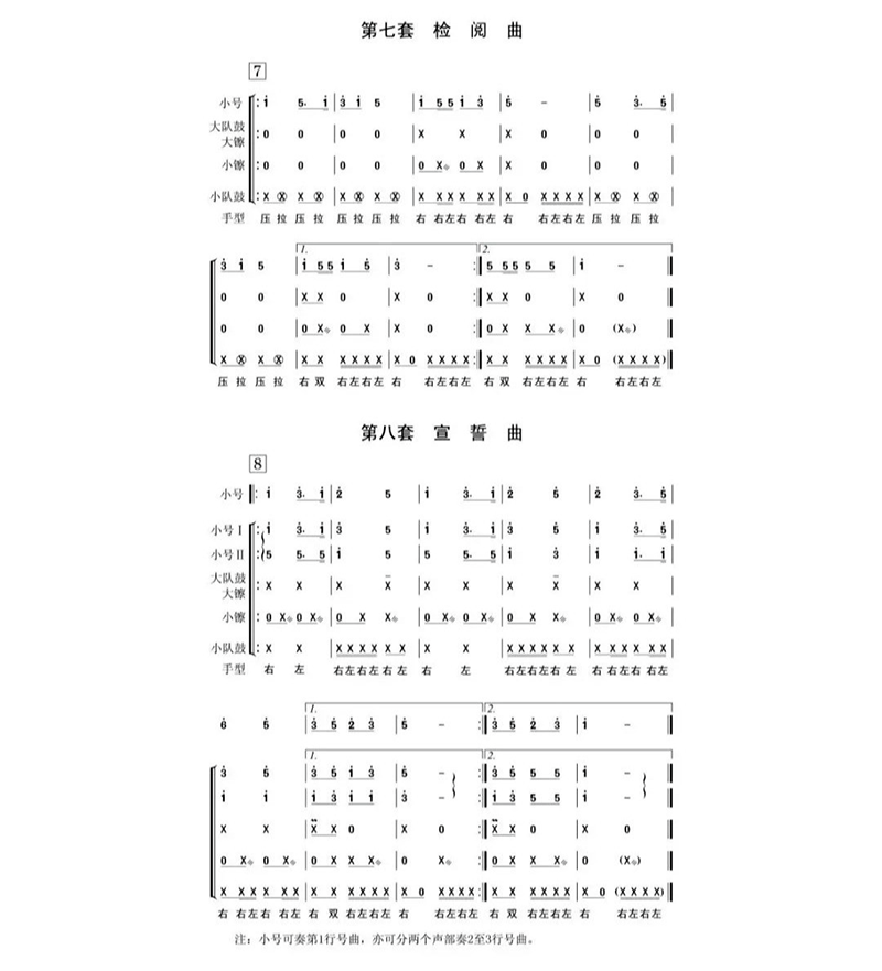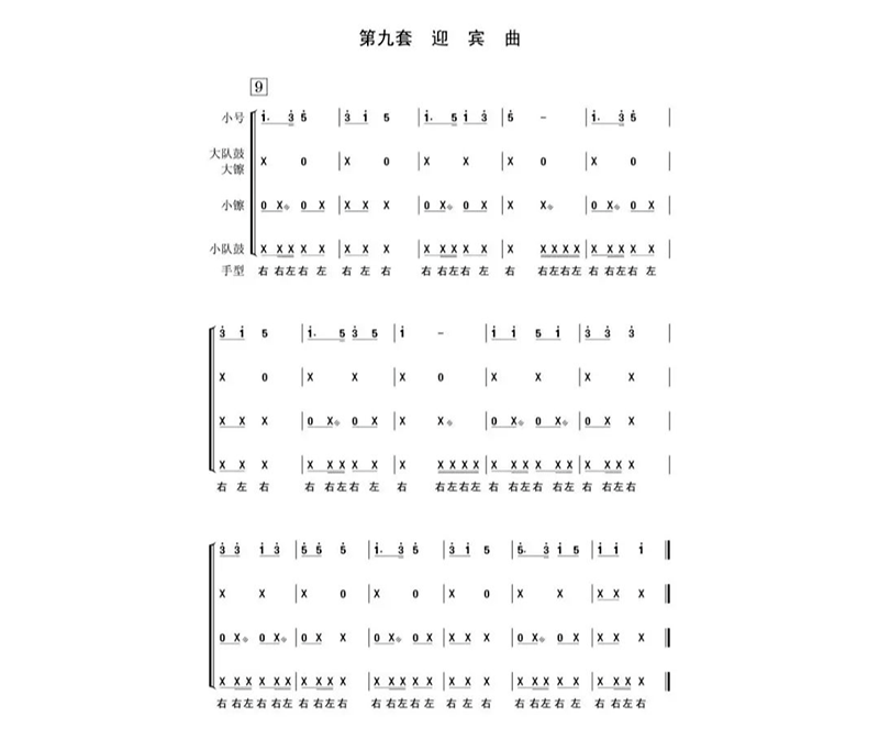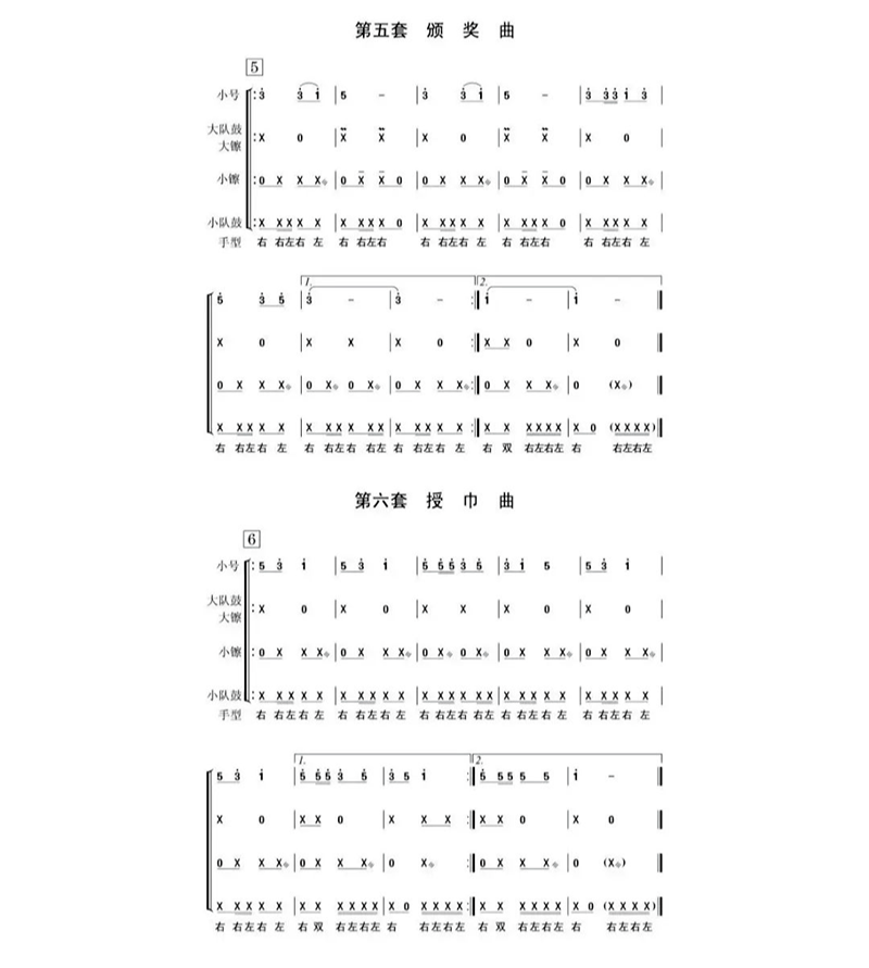 少先队鼓号队总谱除间奏鼓外共10套曲目,包括:开场曲、进行曲、出旗曲、退旗曲、颁奖曲、授巾曲、检阅曲、宣誓曲、迎宾曲、欢送曲。