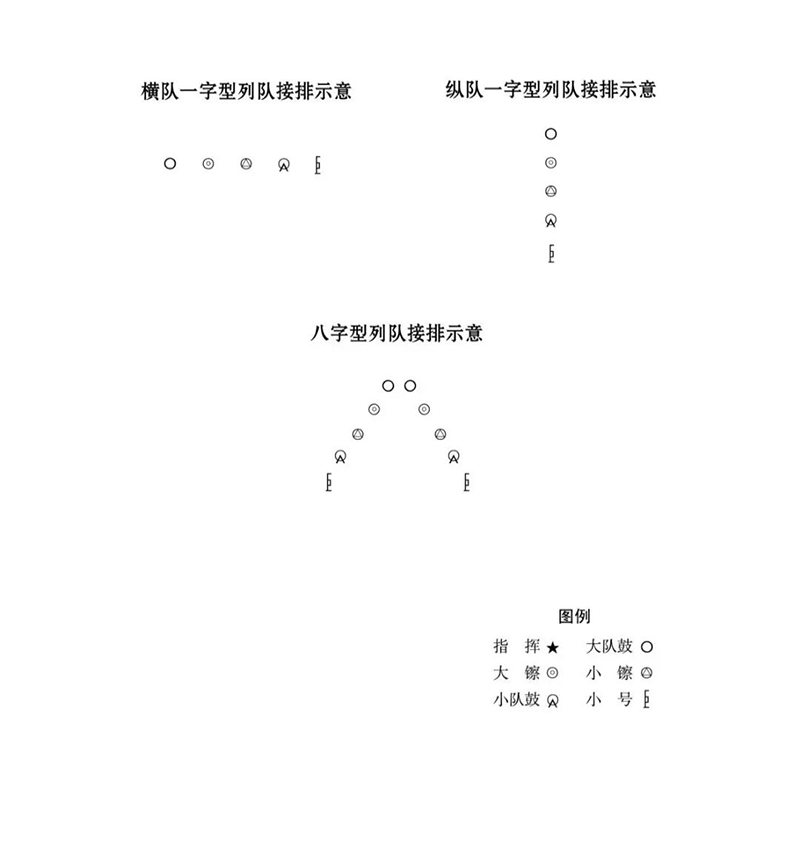 演奏队形可以分为横队、纵队、八字型编队等,可以配备旗手、护旗手。