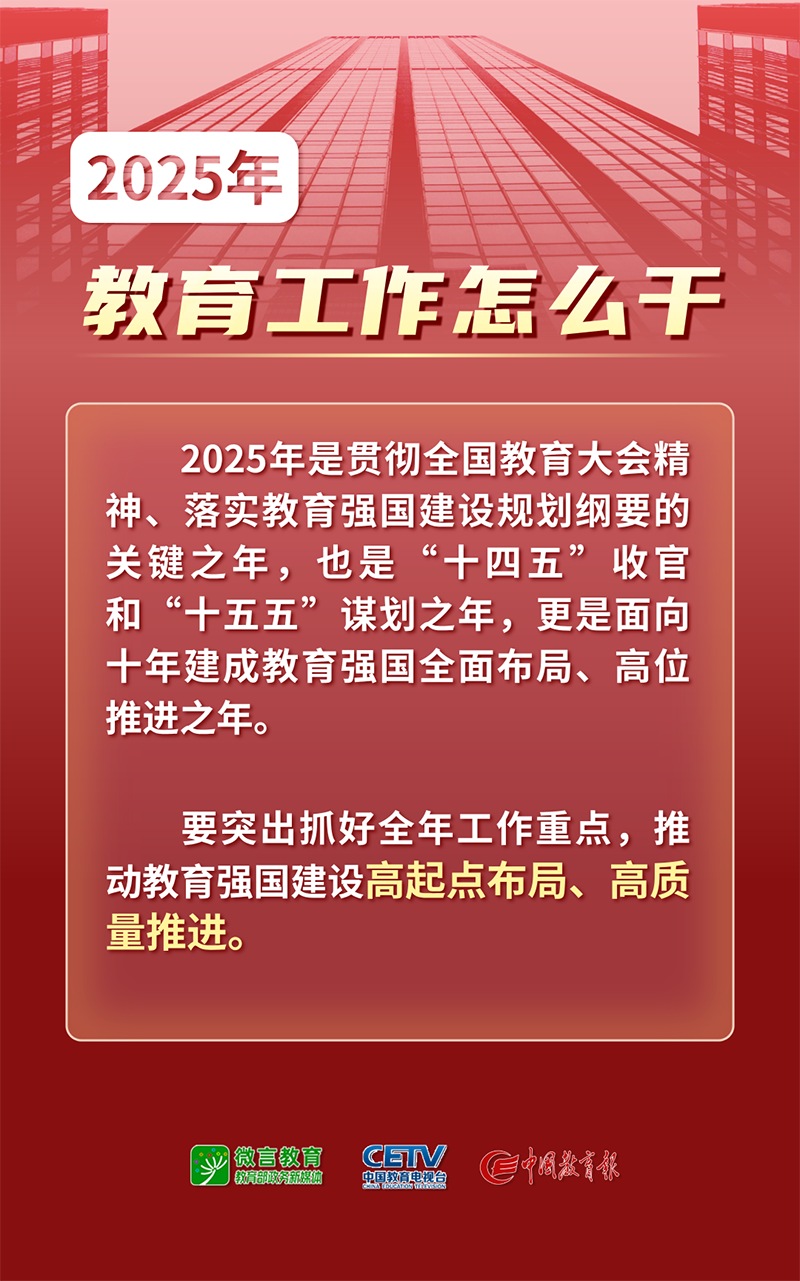 1月9日—10日,2025年全国教育工作会议在北京举行。会议以习近平新时代中国特色社会主义思想为指导,全面贯彻落实党的二十大和二十届二中、三中全会精神,深入学习贯彻全国教育大会精神和习近平总书记关于教育的重要论述,总结工作、分析形势,统一思想、凝聚共识,围绕组织实施教育强国建设规划纲要,安排布置年度重点任务,确保教育强国建设高起点布局、高质量推进。会上说了啥,组图为你划重点——