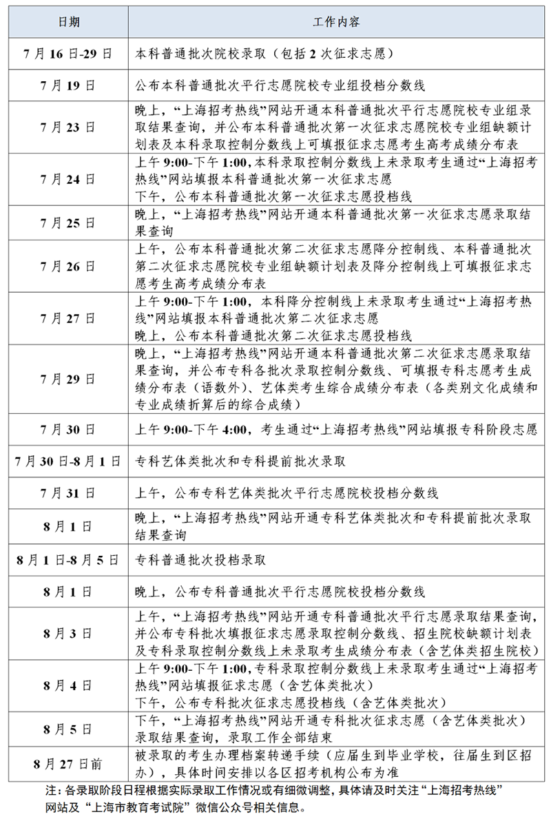 上海市2025年普通高校招生录取工作日程