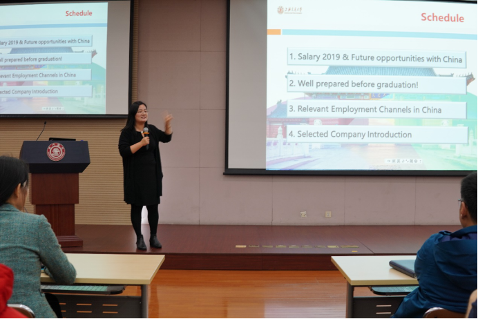 2019年12月18日,上海交通大学国际学生就业指导宣讲会于闵行校区成功举办。本次宣讲会由留学生发展中心组织筹办,现场座无虚席,近两百名国际学生报名参加,其中不乏冒雨从徐汇校区特地赶来的学生。院系国际学生事务管理的老师以及学生就业服务和职业发展中心的老师也受邀出席。 随着综合国力的不断提升,经济全球化的不断深入,中国对于国际人才的需求日趋增长;另一方面,良好的市场环境,高新科技和金融贸易等领域强劲的发展势头也吸引了众多知华友华、希望继续在中国开启职业生涯的国际学生。 宣讲会伊始,留学生发展中心主任李萍为此次宣讲会致辞。李萍指出,近年来我校国际学生招生规模和质量不断扩大和提升,不少学生在这里生活学习几年后结下了中国情结,也为中国的发展机遇所吸引,希望毕业后能够留在中国工作,或者从事与中国相关的事业。为满足广大国际学生的需求,也配合国家对国际学生国内就业的开放政策,留学生发展中心特举办此次宣讲会以期为广大国际学生在就业政策、职业规划等方面提供相关解析和指导,为学生毕业求职拓宽思路和途径。 宣讲会邀请到了上海市出入境管理局的警官,零距离为国际学生权威解读他们最关心的外国人在华工作相关政策。解读内容涵盖外国人在华合法工作需要的条件、办理流程、相关注意事项等。 资深国际学生职业规划指导专家刘思静为同学们全方位解析了求职就业相关问题。内容包括2019年中国行业趋势、薪酬报告、中国企业未来就业机会、毕业前需做好的准备及在中国求职的相关途径。宣讲会现场还设有企业直击环节,邀请到了来自包括携程、创极无限等企业在内的HR为同学们带来精彩的宣讲,从用人单位的角度剖析了对国际人才的需求。 现场互动环节中,国际学生们的提问尤为热烈,各位宣讲嘉宾也纷纷给出了详尽解答。虽然本次宣讲会为时不长,但所提供的信息详实、丰富,为广大国际学生解决了许多切实的问题,得到了参与师生的一致好评。会后师生们纷纷表示收获满满,希望学校能再次举办针对国际学生就业指导的专题宣讲会。 国际学生中国就业需求旺盛,需要正确引导,留学生发展中心将不断积累经验,联合学校相关部处和学院,组织开展更丰富高效的就业指导系列活动,更好地帮助国际学生了解中国就业市场,为他们拓展在华的职业生涯提供行之有效的途径。