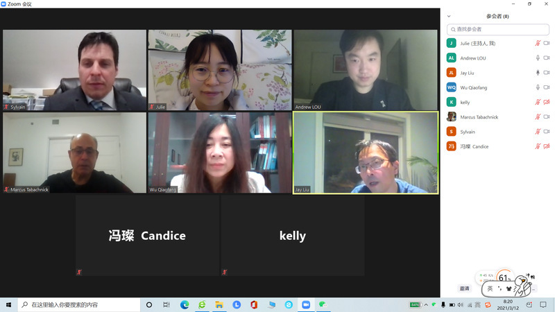 根据国际交流处前期与蒙特利尔国际教育中心接洽情况,Sylvain主任简要介绍了法语培训和测试中心在中国的建设情况,提出了建设要求。Marcus Tabachnick介绍了加拿大疫情防控形势,并表示将在加拿大高校正式开放校园后推进我校学生海外学习、实习项目。刘裕佳就我校留学项目在加拿大招生、与多伦多大学合作办会、合作开展教师培训等事宜与我校代表进行沟通。