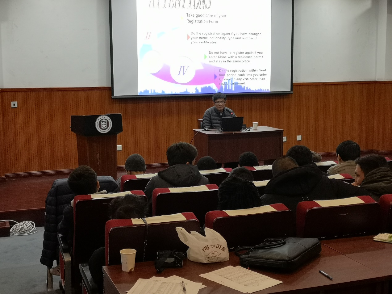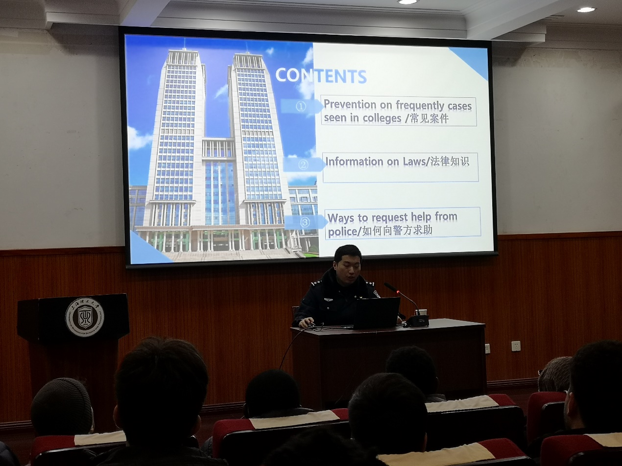 在国际学生全员大会上,学校对全体留学生进行了年度评审的动员,还邀请市文保分局涉外科警官和市出入境管理局签证处警官进行法制宣讲。
