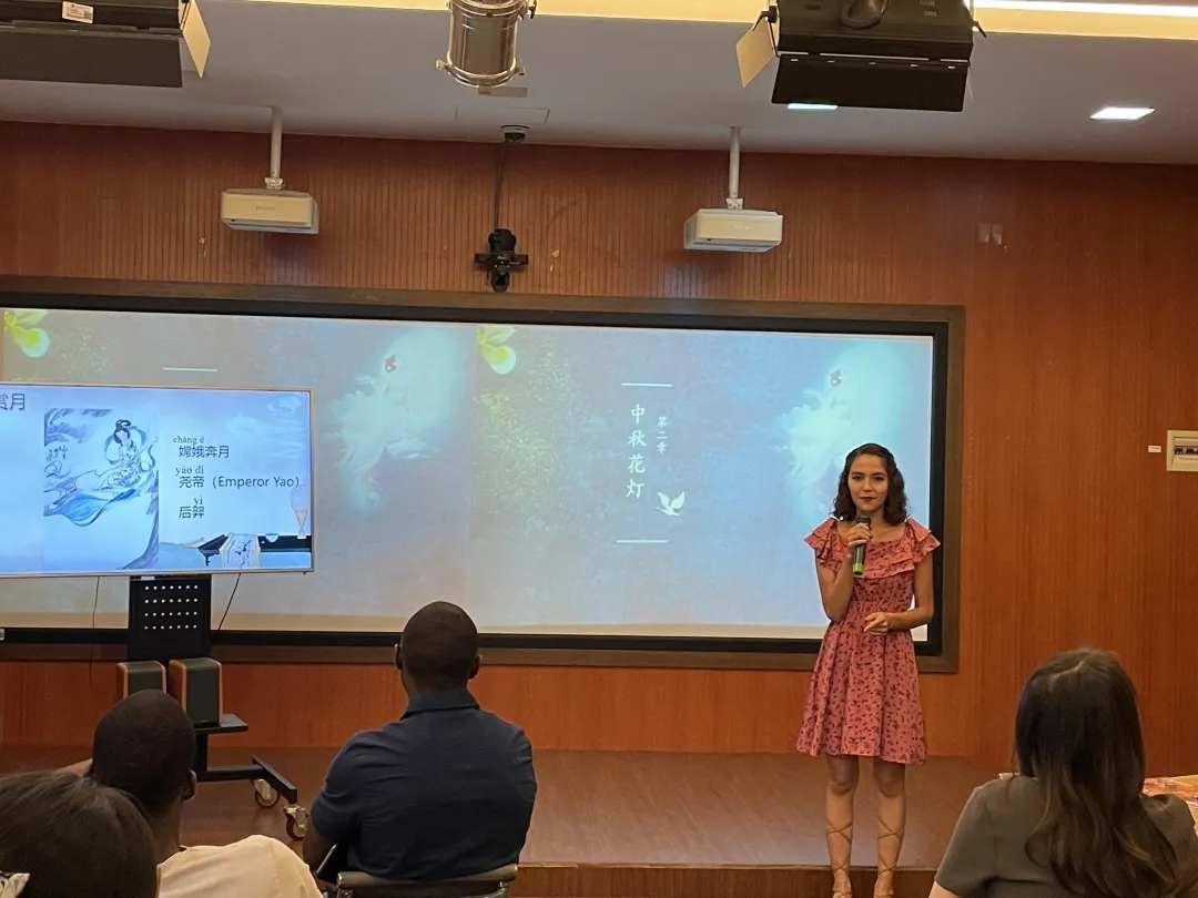 活动开始,由“汉国教”团队教师贾婷老师为大家带来一堂生动形象的中秋主题文化体验课。贾老师给国际学生们讲述了中秋节的起源、由来以及现代中秋节对于中国人的意义。来自土库曼斯坦的本科生梦洁同学,用中文生动地为大家讲述了“嫦娥奔月”的故事。