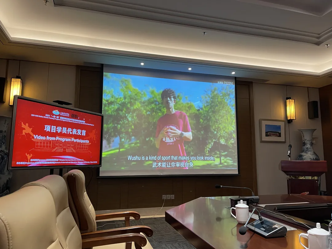 为使学员更快融入课程,现场一同观看了上海体育学院宣传片和2019年带路武术项目纪录片。来自西班牙、墨西哥、罗马尼亚的三位学员分享了其对武术和中国文化的心得。来自西班牙的威尔说道,武术是他的第二生命,占据了他生活中的一大部分,但武术给他带来的不仅仅是身体上的健壮,武术也能锻炼他的内在修养,让他始终学会审视自身,不断超越自我,勇攀高峰。三位学员纷纷表达,他们领悟到的武术精髓是内心世界的强大,这种精神或许就是一代代武术家们传承品质的最佳体会。