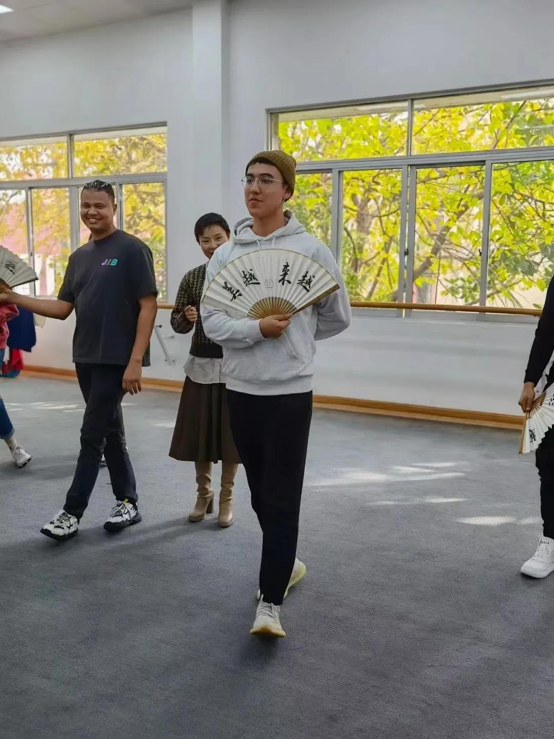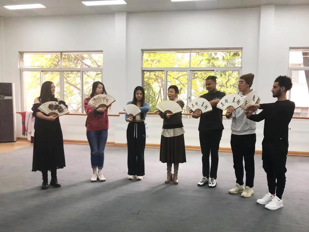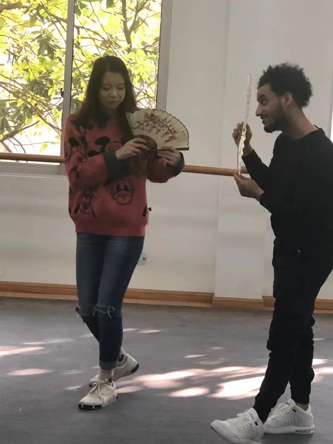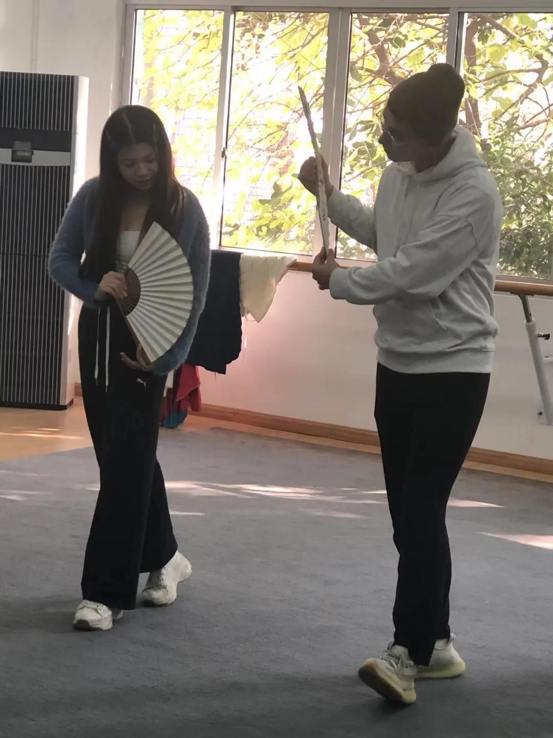 在精彩的互动环节,同学们一起学习了两个经典越剧舞台动作:开扇和甩水袖。善于模仿的同学们很快就学得有模有样了。