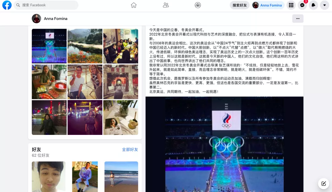 俄罗斯此次也派出由461人组成的奥运代表团,其中不乏世界级名将,参加所有项目比赛。2022年也是俄中体育交流年的开幕之年。当俄罗斯代表团成员身穿蓝色民族服入场时,我为祖国感到骄傲与自豪。想借此次机会,愿俄罗斯以及所有参加冬奥会的运动员加油,满载而归创辉煌!