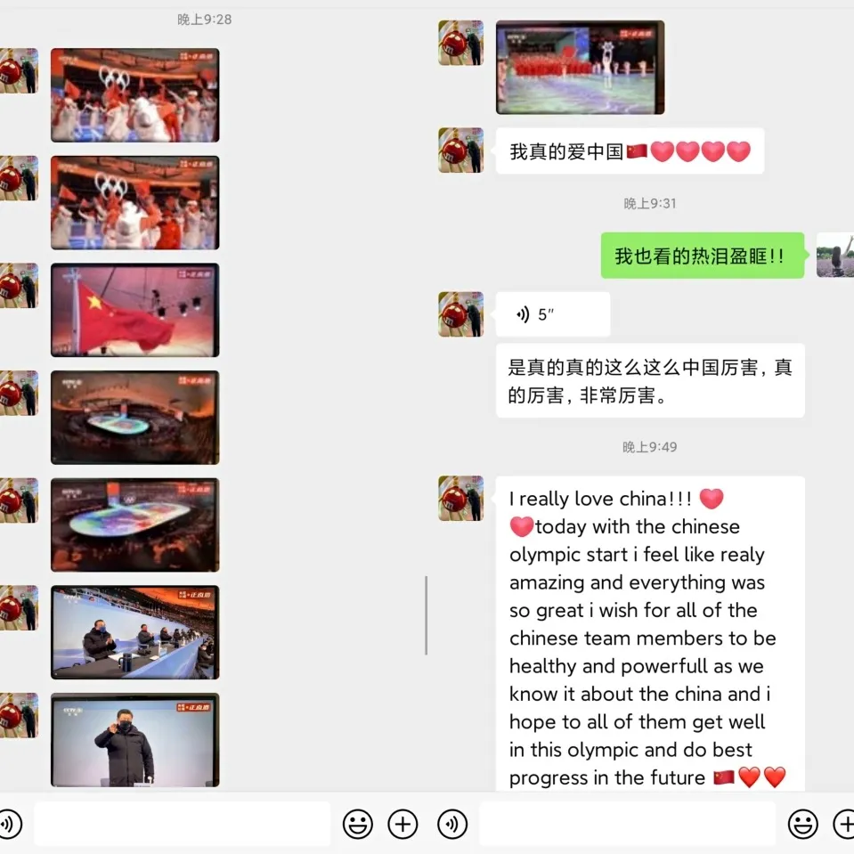 在观看时,真的是内心充满了敬佩!不可思议的是,技术被用于如此美丽的活动,将中国文化与理念如此巧妙的传递。中国成功了,再次让全世界看到了她的实力。正如北京冬奥会的主题口号“一起向未来”, 谁赢都无所谓,其实最大的收获就是参与、交流。我特别特别喜欢这个口号,在新冠肺炎疫情依旧肆虐全球的当下,团结变得前所未有的重要。我希望这次活动能够再次提醒所有人和平共处的价值。我希望世界上的COVID-19病毒在不久的将来完全失去。世界上所有的人都有机会在他们想去的任何地方舒适地旅行,就像在过去一样。