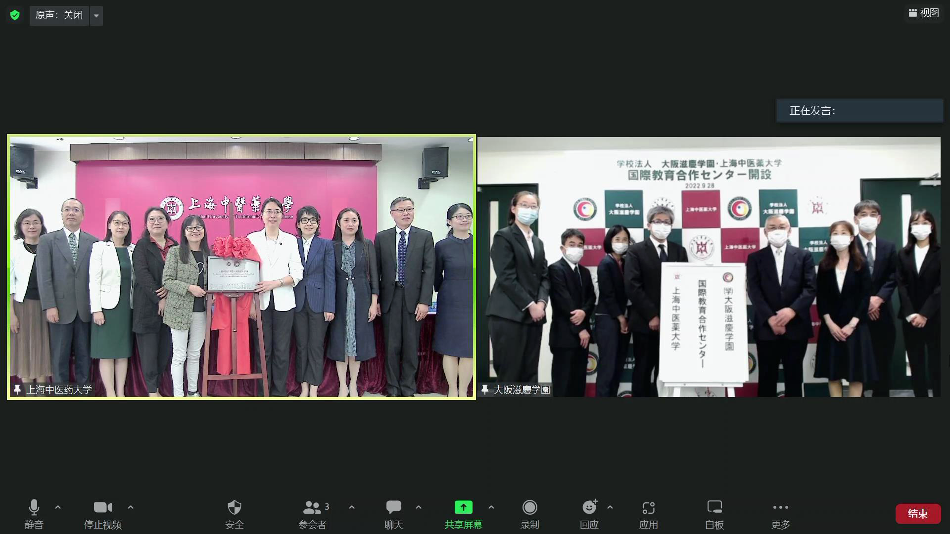 9月28日,我校与日本大阪滋庆学园共建的“国际教育合作中心”线上揭牌仪式在国际交流合作中心举行。我校副校长舒静、针灸推拿学院院长赵琛、国际交流处副处长傅勤慧、护理学院党总支副书记李媛、康复医学院党总支副书记毕亚男,日本大阪滋庆学园常务理事桥本胜信、次长福士晓也,两校有关部门负责人、师生代表等近30人出席线上揭牌仪式。会议由我校国际教育学院院长韩丑萍主持。