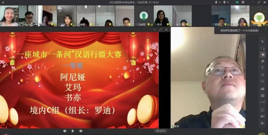 结业仪式上,学院党委正处级专职组织员蔡蓉老师宣布了荣获年度学习优秀奖、全勤奖的表彰名单;副院长荣军老师为“一座城市一条河”汉语行摄大赛获奖选手颁发了电子“奖杯”。时光不负有心人,同学们用辛勤汗水浇灌的花朵,终于在这一刻绚丽绽放。