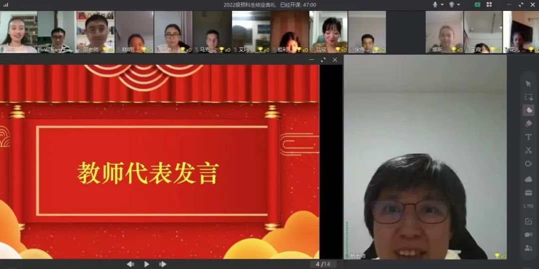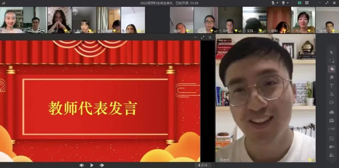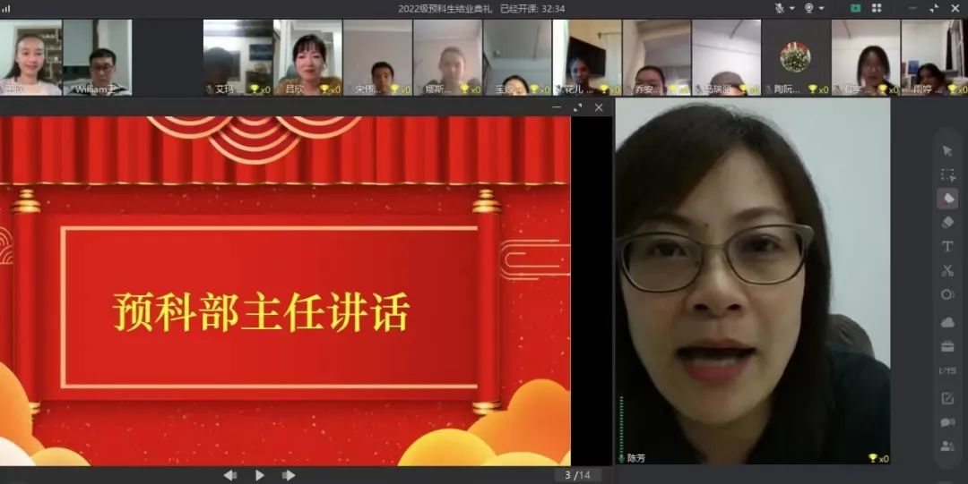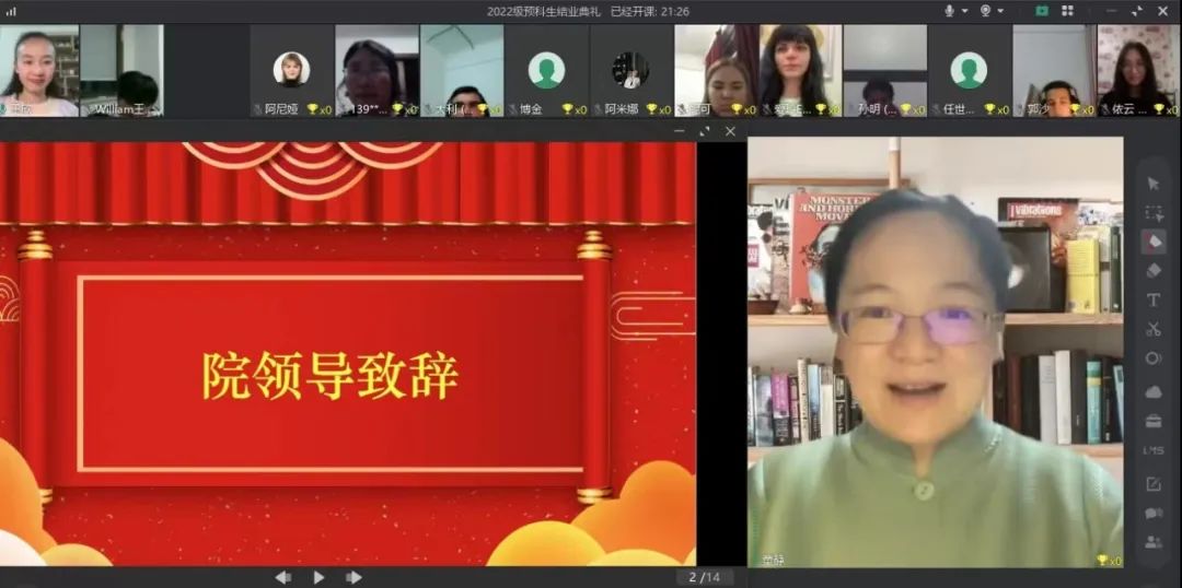 7月11日,上海财经大学2023届中国政府奖学金来华留学预科生结业典礼在线举行。国际文化交流学院院长董静、学院党委正处级专职组织员蔡蓉、副院长荣军与预科部全体师生“云”聚一堂,回顾过去,展望未来。