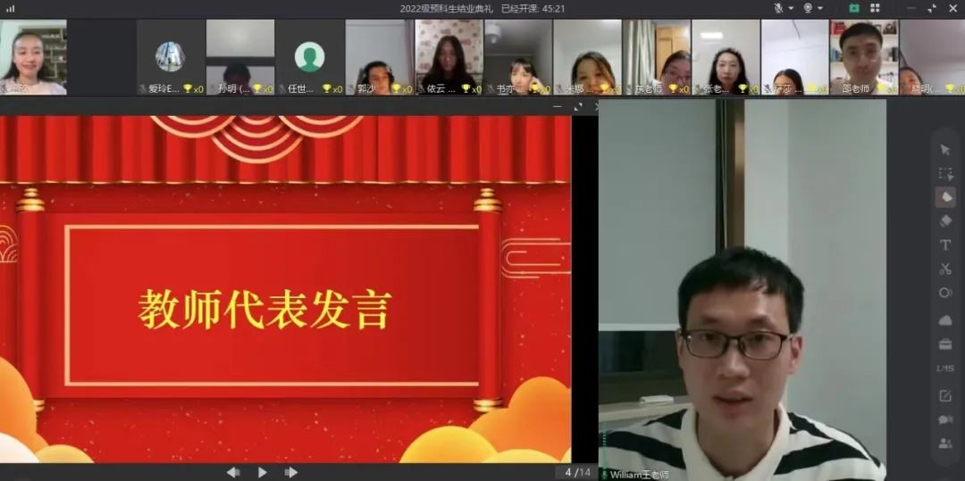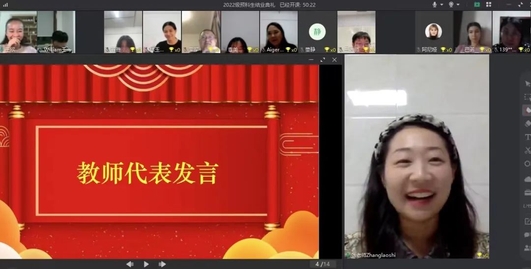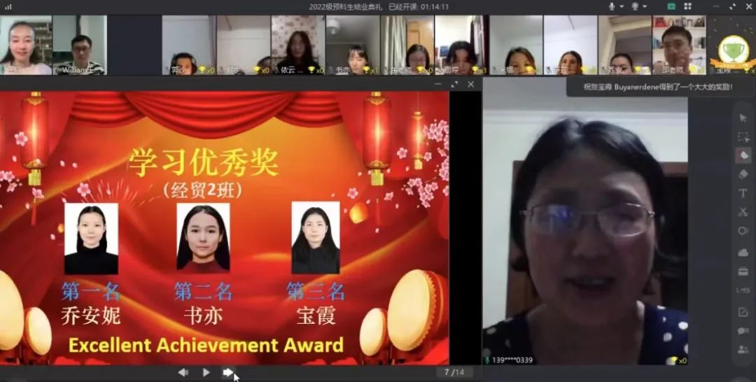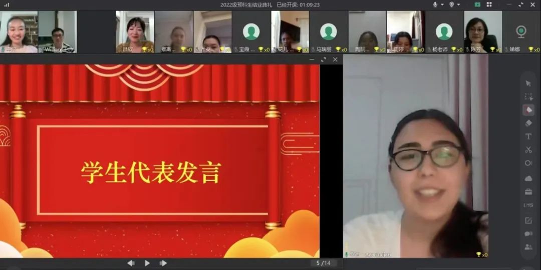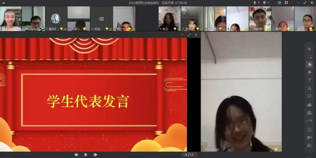 “我的结业典礼我做主”,两位嘉宾小主持郭沙和书亦通过同学们精心制作的视频,回顾了这一年大家在境内外的学习历程和生活点滴。一曲《同桌的你》满载回忆,道不尽离别的祝福。聊收获、谈期待,以梦为马奔赴人生新篇章。学生代表米娜、君宇、艾丽、罗迪纷纷发言,表示在这充实而难忘的一年中,不但学到了知识与技能,而且结交了新朋友,丰富了人生经验。她们感谢学院及老师们的帮助、支持和鼓励,也祝愿同学们结业快乐,前程似锦,取得更大的进步!