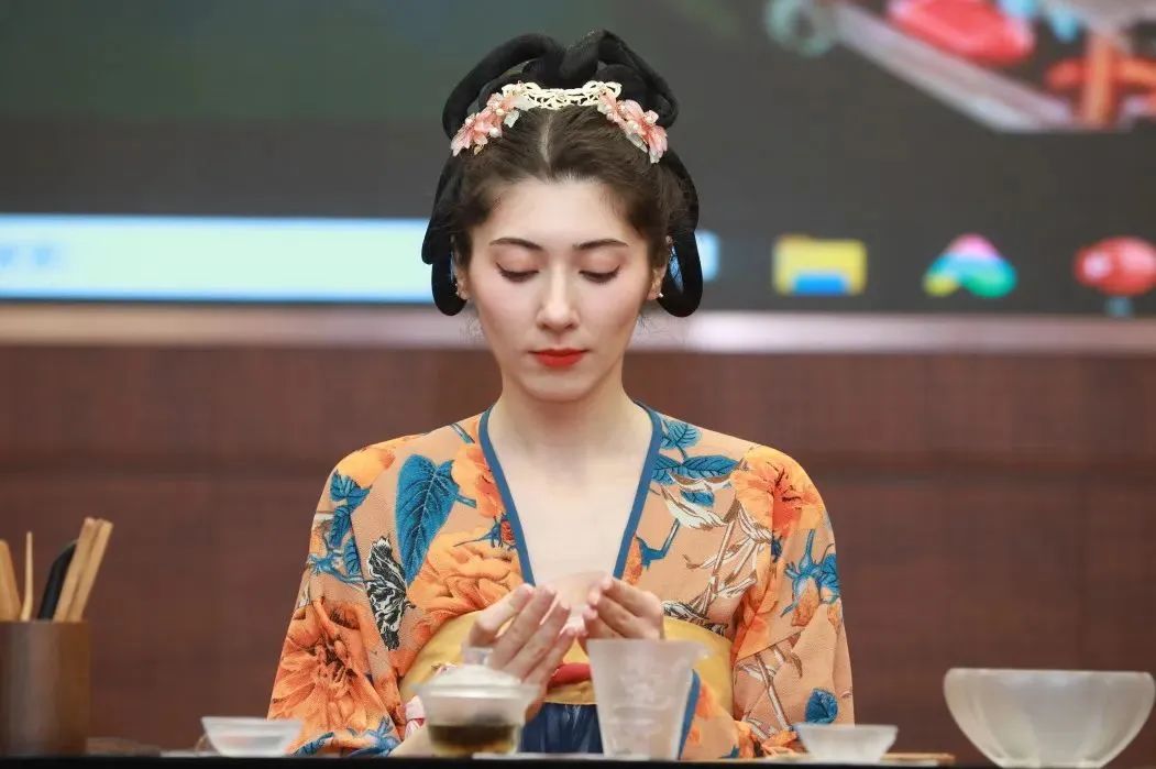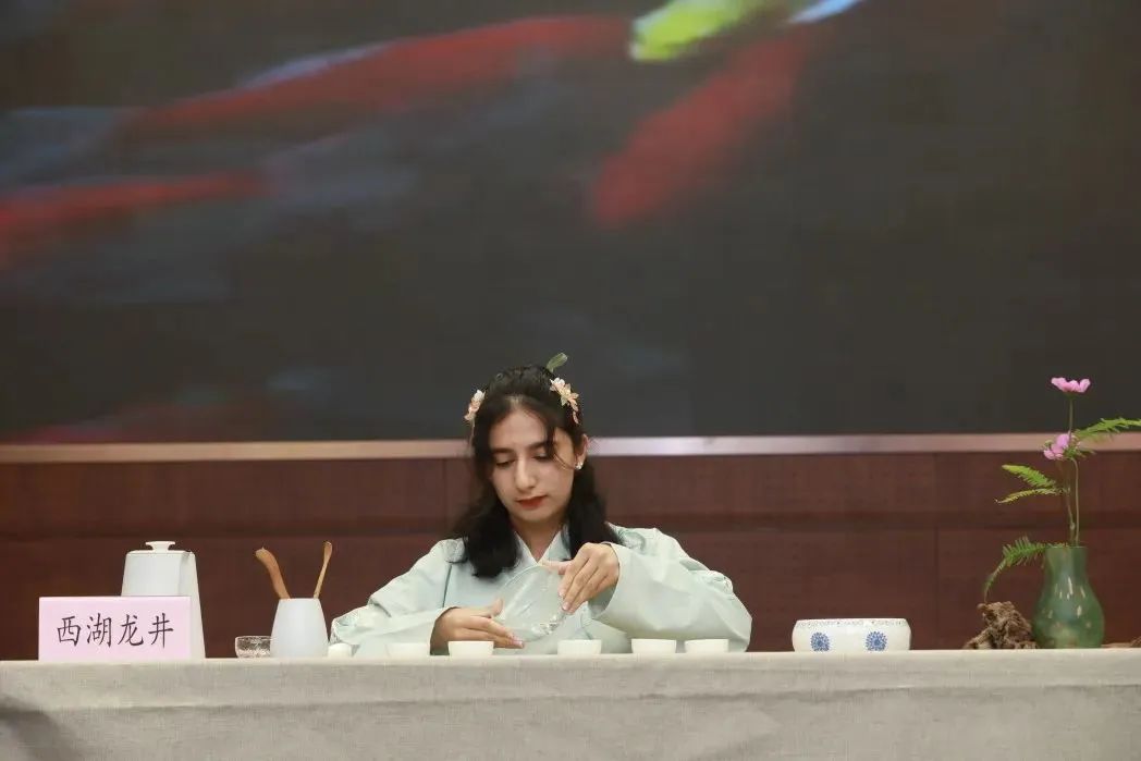 茶会活动中安排了丰富多彩的文艺表演,我校三位国际学生,来自俄罗斯的马莲、越南的武青草和阿塞拜疆的阳雪身着汉服进行了红茶(正山小种)、乌龙茶(大红袍)以及绿茶(西湖龙井)的茶艺表演,典雅的音乐,清新的背景,伴随着茶香,使茶会氛围更加古韵悠长。本次活动还邀请了青年琉璃艺术家郑珊珊介绍琉璃茶器,非遗传承人高晴介绍中国香道以及非遗传承人王薇介绍中国插花。最后由崔希亮教授的书法展示“茶和世界”将本场活动推向高潮。