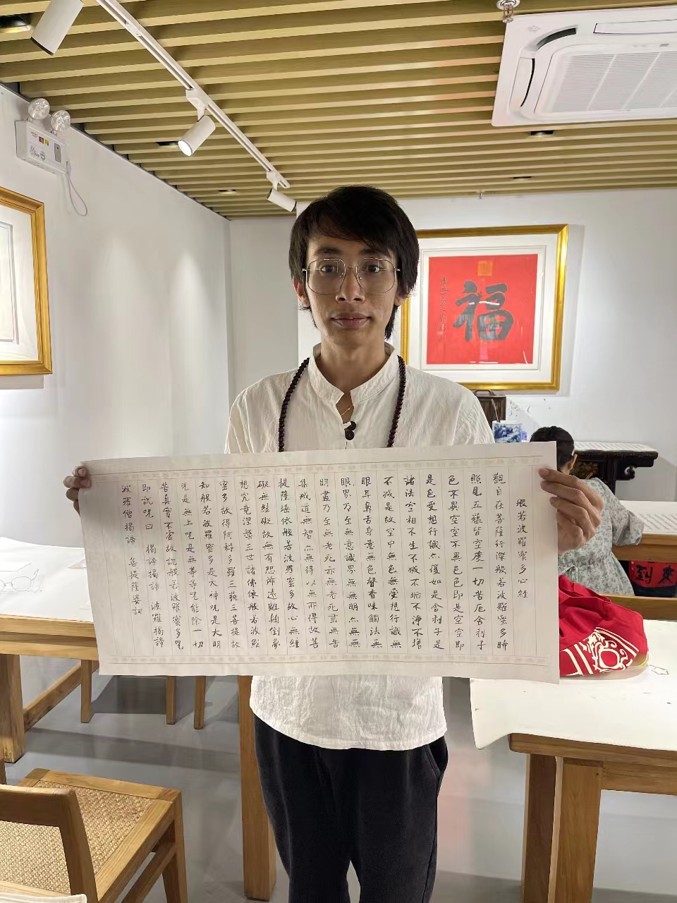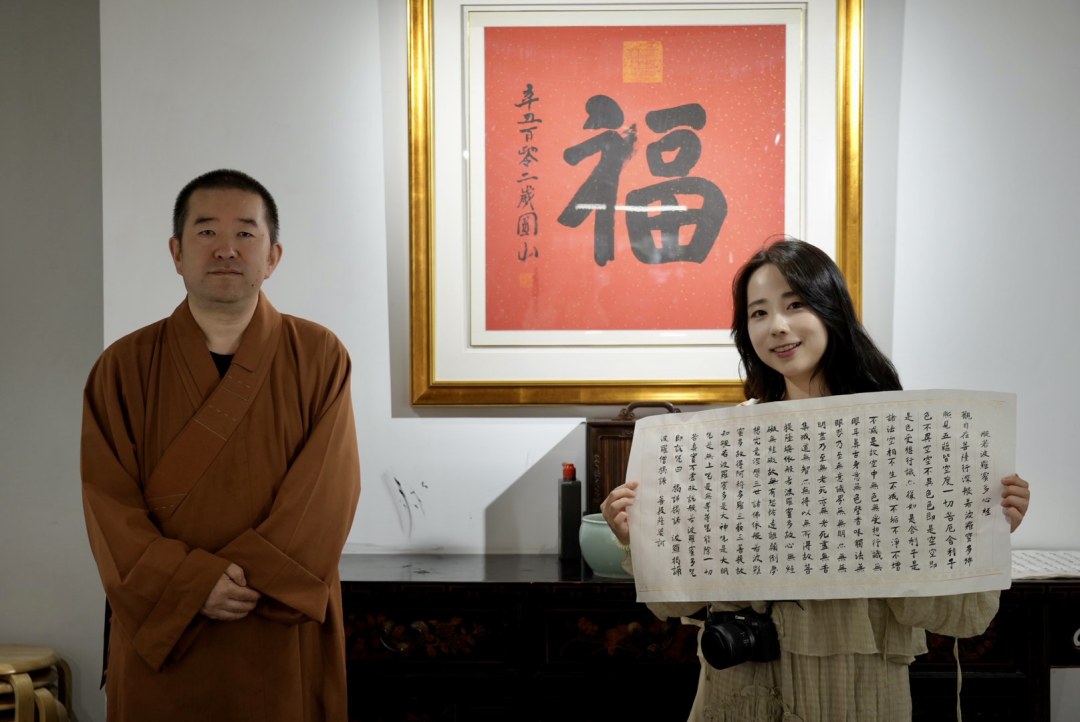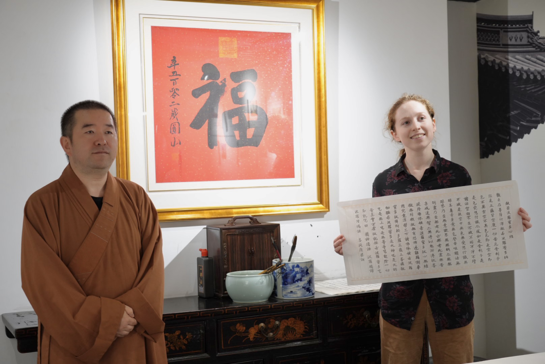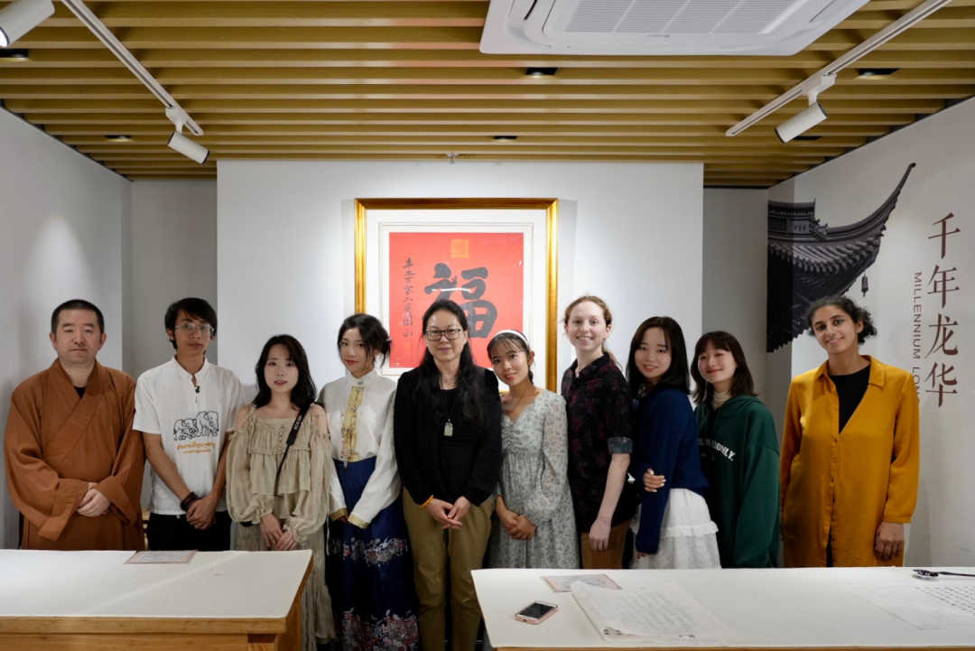 最后,同学们在抄经室体验了用毛笔抄写心经,为自己及亲人祈福。在吉祥融合的气氛里,上戏留学生一行满怀欢喜结束访问。