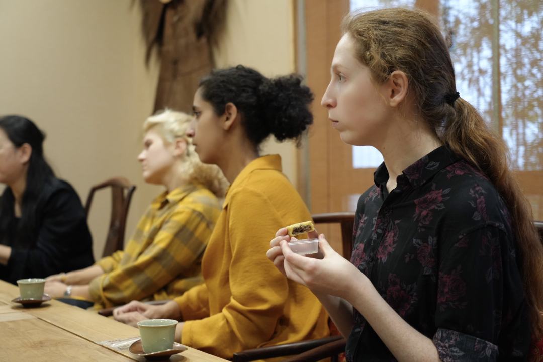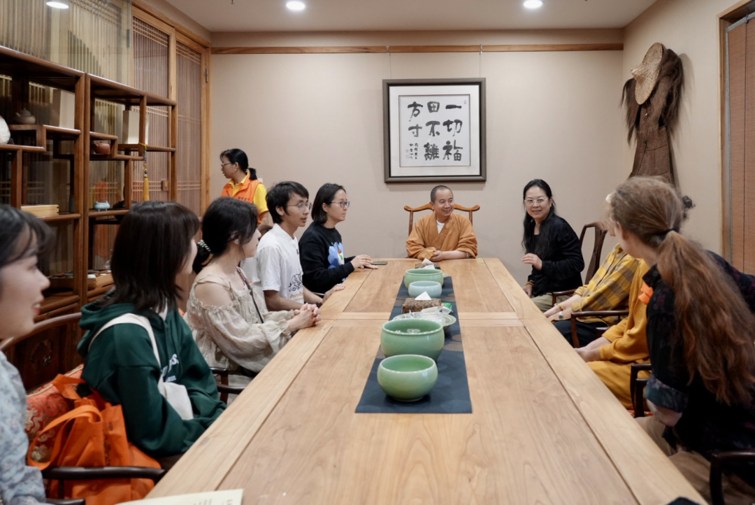 在禅茶室,龙华古寺副寺满空法师热情接待了上戏留学生师生一行,法师向同学们介绍了古寺的发展历史及对外交流等情况,并与在场同学一一交流,从各国宗教到历史人文,从饮食习惯到修行方式,禅茶一味,道悟人生。