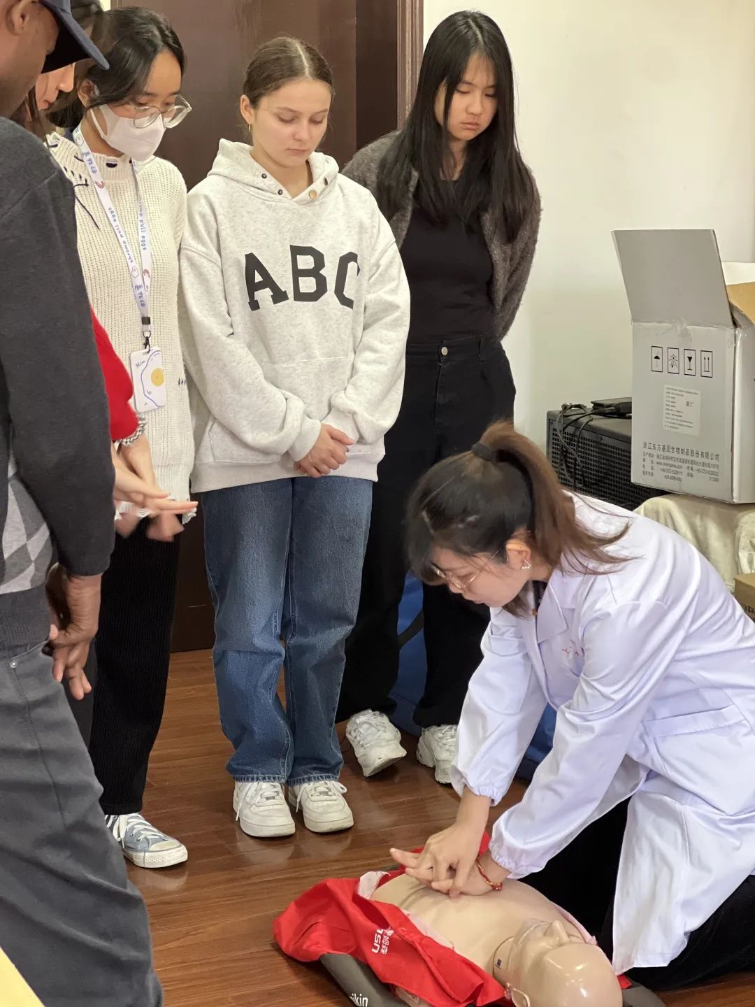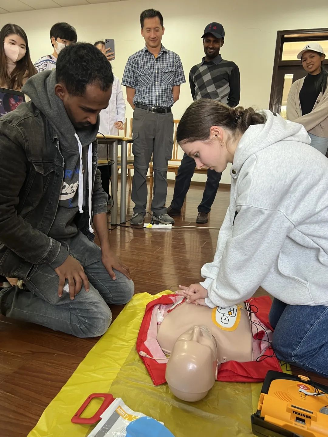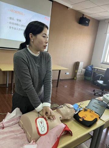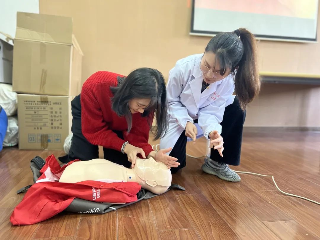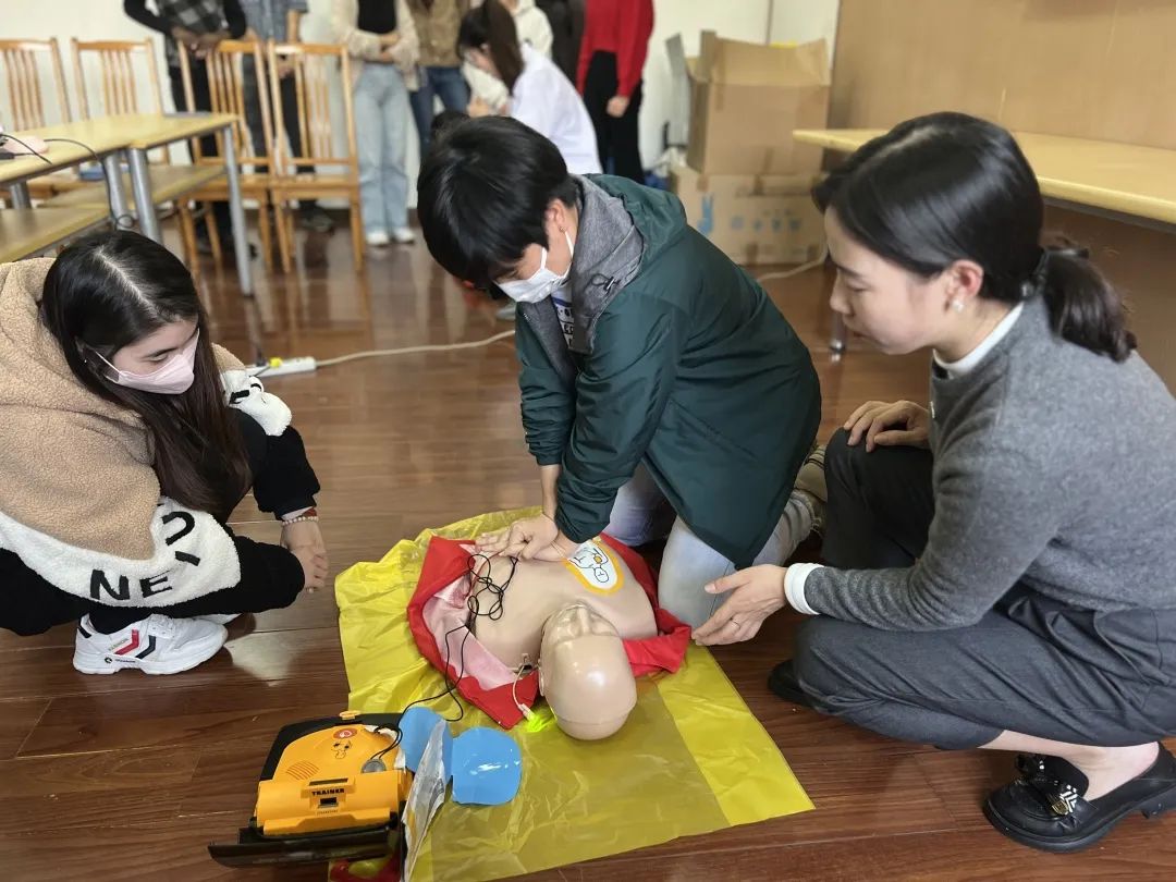 培训开始,吴红艳讲师用简单易懂的中文为参与培训的国际学生们详细讲解了急救原理的基本知识,和邓医生一起分步详细地为大家演示了如何正确有效地实施心肺复苏。通过吴老师和邓医生生动的讲解和互动,学生们全面了解了心肺复苏操作步骤和AED使用方法。理论知识与实际操作相结合,使学生们更深入地理解和掌握了急救技能。