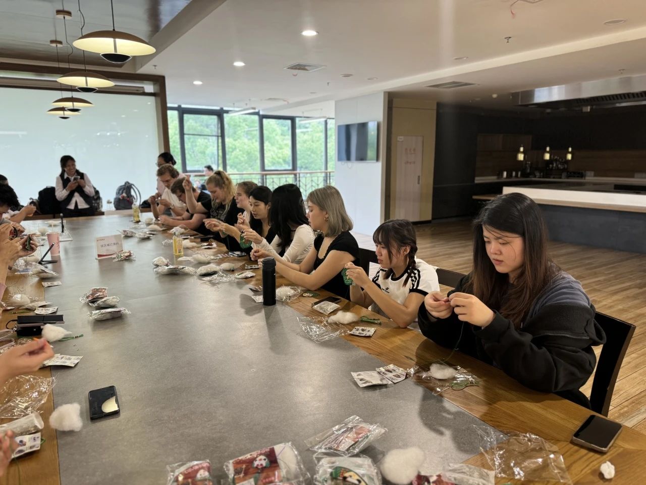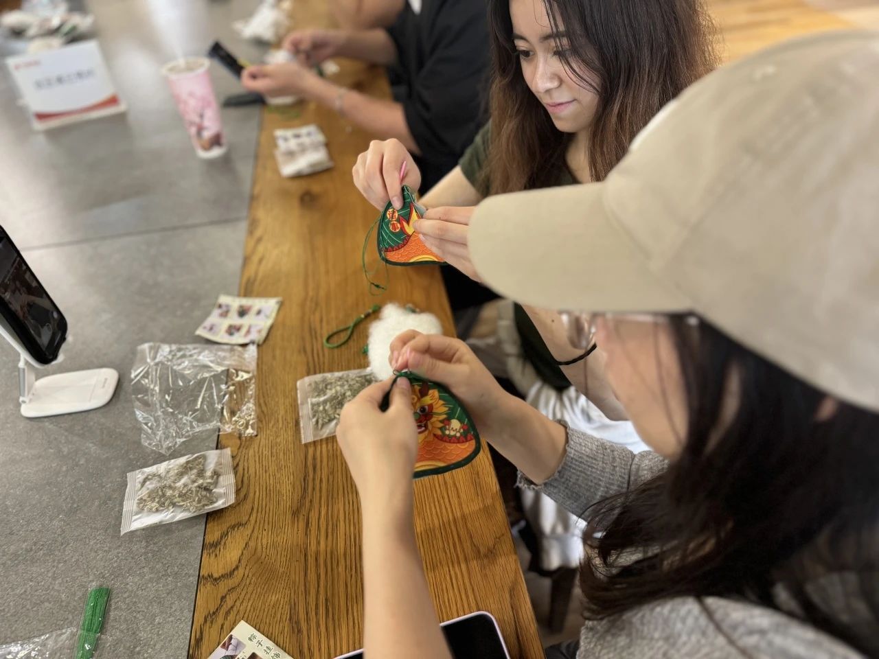 端午节除了吃粽子,还有佩戴香囊的习俗。在等待粽子蒸煮期间,留学生们还亲手缝制了端午香囊。艾草散发阵阵清香,令同学们爱不释手。
