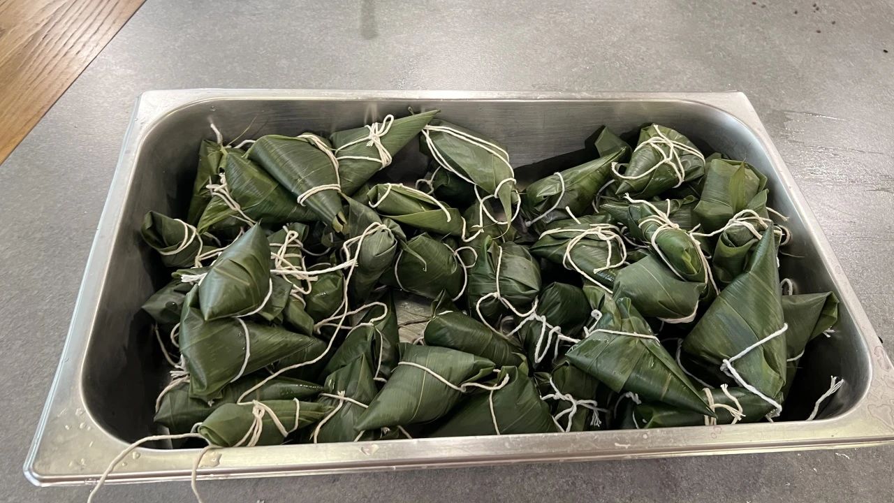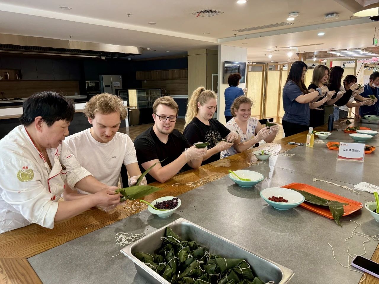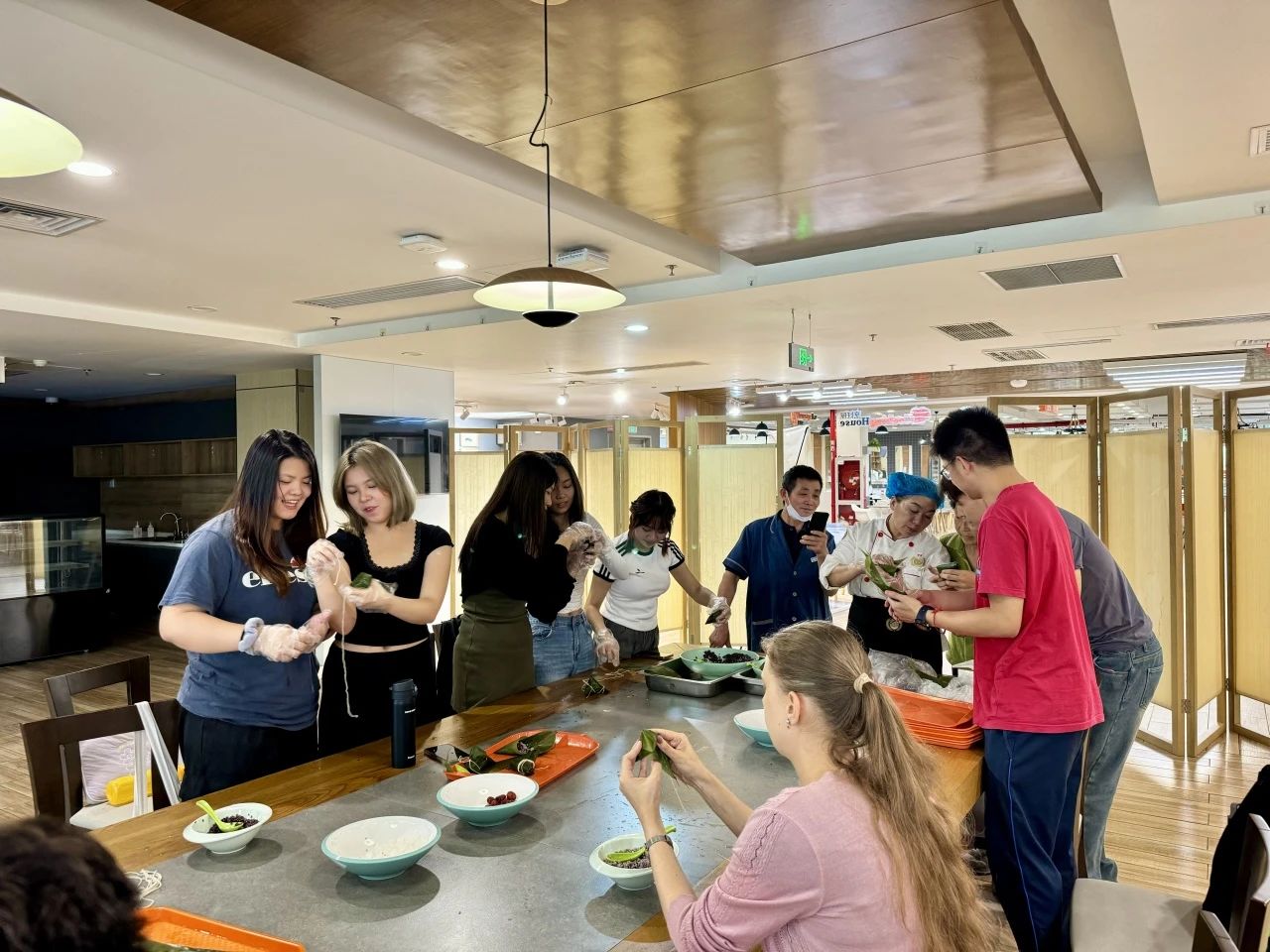 随着农历五月初五端午节的到来,2024年6月5日,正值芒种的节气,复旦大学外国留学生工作处在北区食堂二楼开展了“舌尖上的夏天——粽子DIY"活动。来自美国、德国、匈牙利、瑞典、荷兰、澳大利亚、马来西亚、新加坡等国家的近20名外国留学生们参与了此次活动。