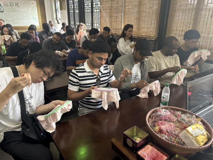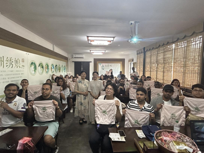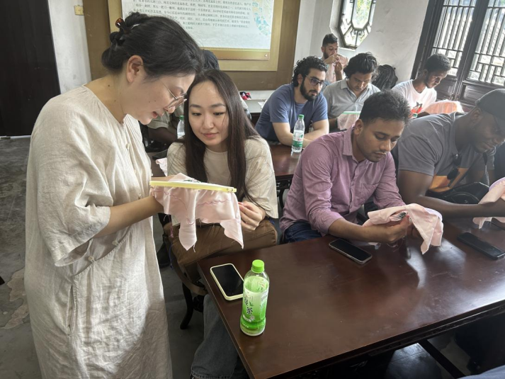 在文化体验环节,国际学生们在专业绣娘的指导下,亲手学习制作苏绣这一国家级非物质文化遗产。绣娘们耐心讲解苏绣的历史渊源、技艺特点和创作过程,让国际学生们深刻感受到了中华传统文化的博大精深和独特魅力。通过动手实践,国际学生们不仅学会了基础的刺绣技巧,还亲手制作出了一幅幅精美的苏绣作品。