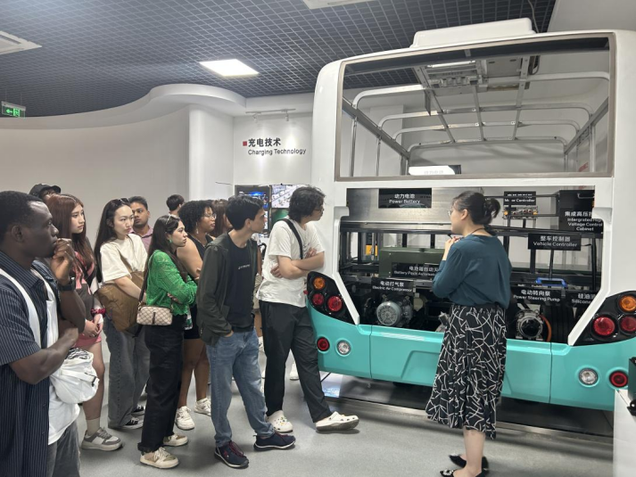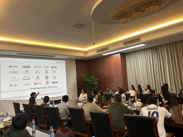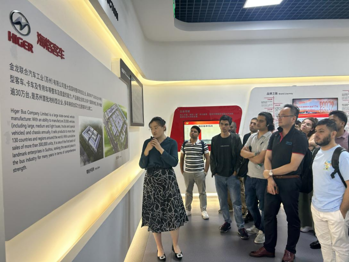 活动当天,研学团一行首先来到了金龙联合汽车工业(苏州)有限公司——海格客车的总部进行调研。在这里,国际学生们通过观看企业宣传视频,初步了解了海格客车在全球客车行业的领先地位。随后,在讲解人员的引导下,大家近距离参观了数辆精心设计的成品客车。这些客车展示了海格客车在技术创新、节能环保以及乘客舒适度方面的卓越成果,让国际学生们对“中国制造”的精湛工艺和高端品质有了更直观的认识。在座谈交流环节,企业代表详细介绍了海格客车的发展历史、企业文化以及在全球市场的布局情况。国际学生们听得津津有味,积极提问,与企业代表就技术革新、市场战略等话题进行了深入的交流。海格客车作为客车行业的佼佼者,其“行稳致远,走向深蓝”的品牌发展理念深深打动了每一位在场的国际学生。
