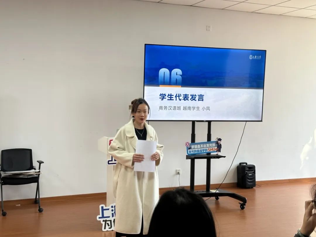 临别之际,同学们心中充满了感慨和不舍,商务汉语班越南学生小凤作为学生代表,发表了临别赠言。她回忆在上海大学这几个月的学习生活,感谢老师的悉心指导和无微不至的关怀,这段学习经历让她对未来的生活充满了信心和力量。