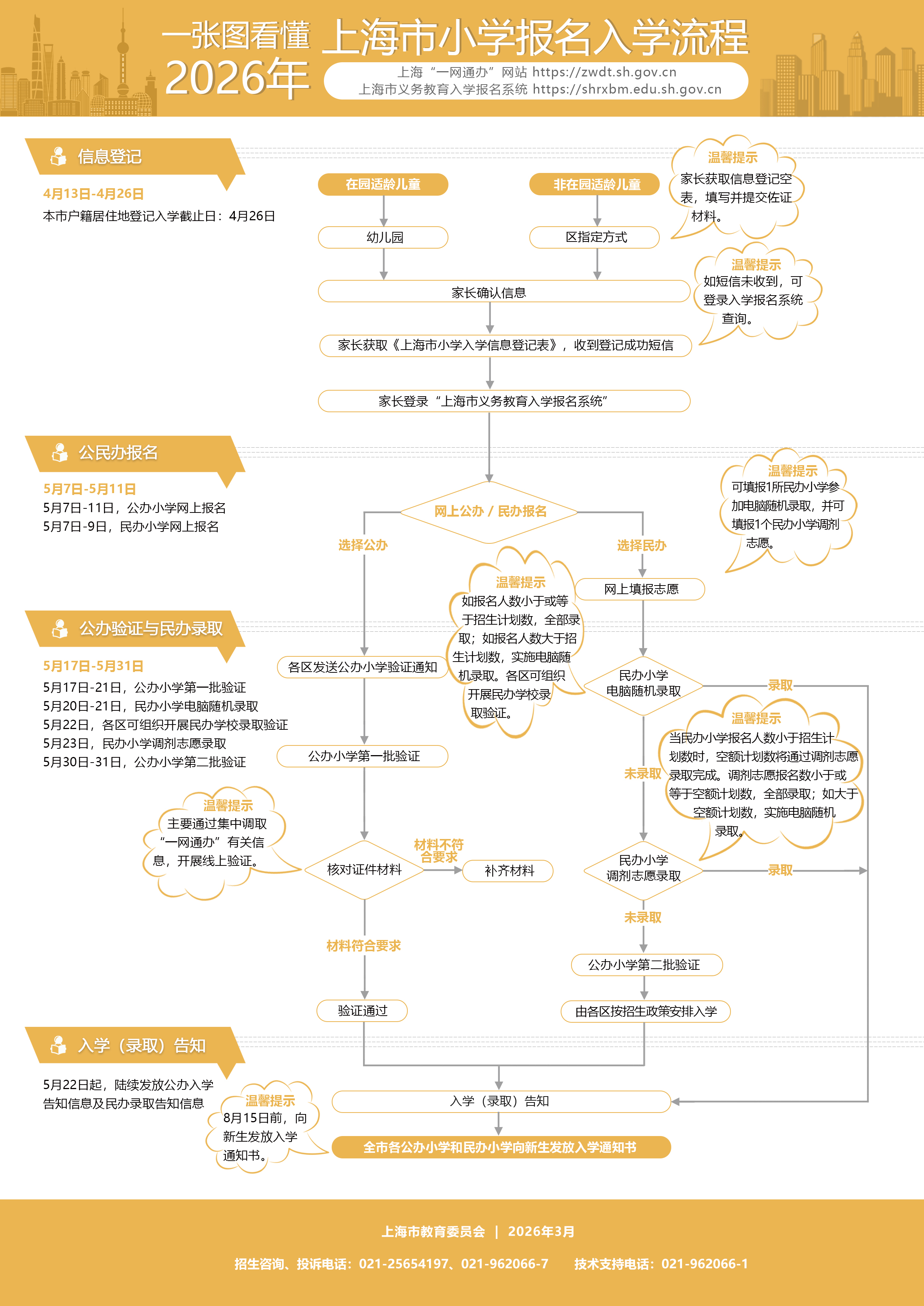 4月13日至4月26日,在园适龄儿童家长通过幼儿园登记儿童入学信息,未入园适龄儿童家长通过各区指定方式登记儿童入学信息,获取《上海市小学入学信息登记表》和“入学报名告知书”,作为入学报名的重要依据。