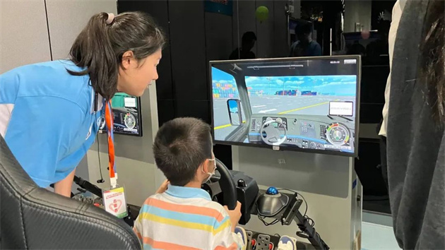 3天中,先后有600余中小学生在其家长的陪同下来上海港湾学校体验。他们在游戏中学习相关技能,加深对港航行业的了解,亲身感受不同职业的工作内容与挑战,拓宽了自己的眼界和知识面。在实训中心一楼“百灵顿码头探险记”中,学校邀请上海市劳动模范、全国交通系统劳动模范、全国交通技术能手等多项荣誉称号的辛宝良老师作为指导老师,为前来体验的同学们仔细讲解码头桥吊;设在实训中心二楼的“仓储小达人”“我是叉车王”“杰克船长漂流记”和“小小集卡驾驶员”等项目深受同学们喜欢;在“杰克船长漂流记”体验的一位小学生说:“我从小就对开车、开船非常感兴趣,这次看到港湾学校有这个项目就迫不及待地来体验了。这个项目太好玩了,我在体验的时候要眼观六路,时刻注意航线和障碍物,真是非常开心的一次体验。”而“心跳求生VR俱乐部”“彩虹港VR漫游”等项目,则让同学们“零距离”感受了一次港口工作……